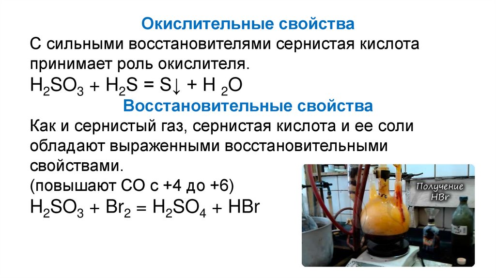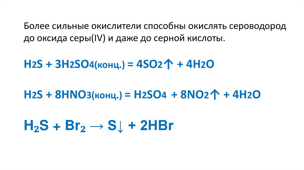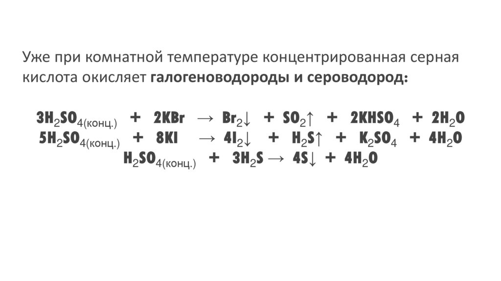 Уже при комнатной температуре концентрированная сернаякислота окисляет галогеноводороды и сероводород: