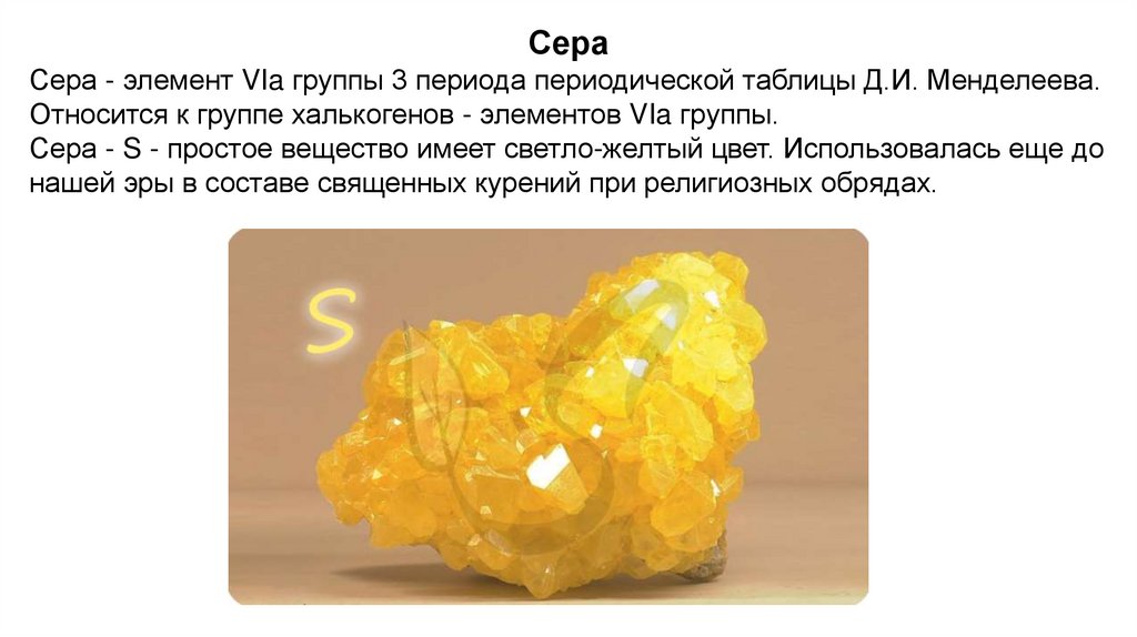 Сера - S - простое вещество имеет светло-желтый цвет. Использовалась еще до