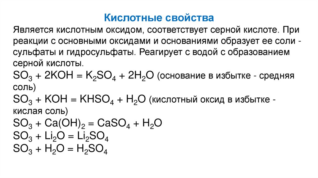 SO3 + KOH = KHSO4 + H2O (кислотный оксид в избытке кислая соль)