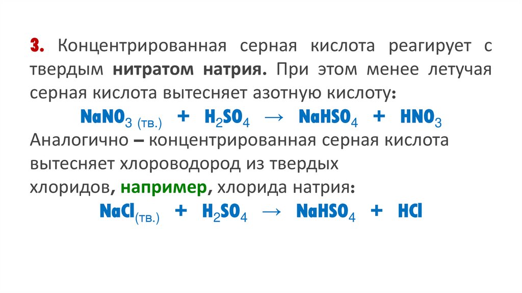 3. Концентрированная серная кислота реагирует ствердым нитратом натрия. При этом менее летучая