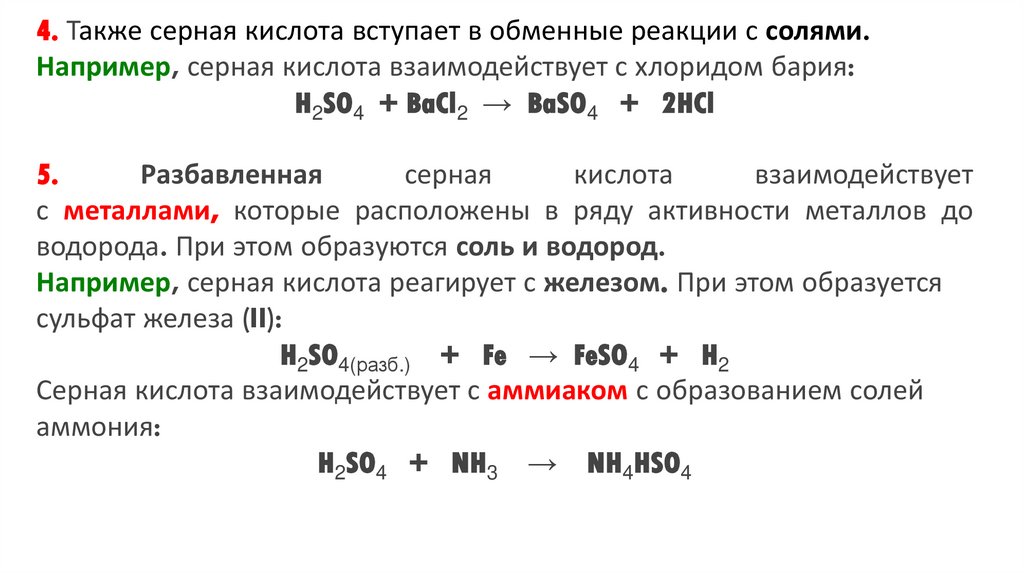 4. Также серная кислота вступает в обменные реакции с солями.Например, серная кислота взаимодействует с хлоридом бария: