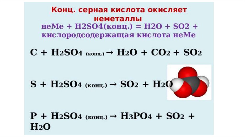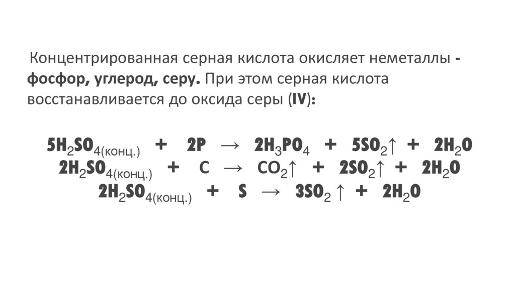Концентрированная серная кислота окисляет неметаллы фосфор, углерод, серу. При этом серная кислотавосстанавливается до оксида серы (IV):