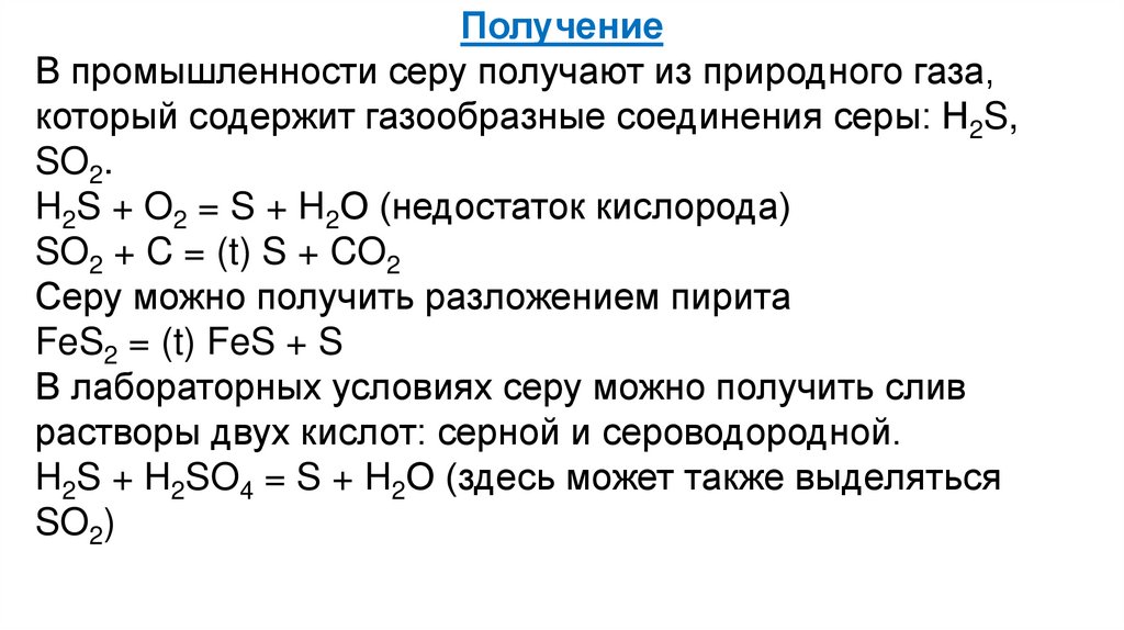 ПолучениеВ промышленности серу получают из природного газа,