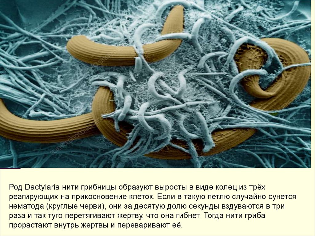 Род Dactylaria нити грибницы образуют выросты в виде колец из трёхреагирующих на прикосновение клеток. Если в такую петлю случайно сунется