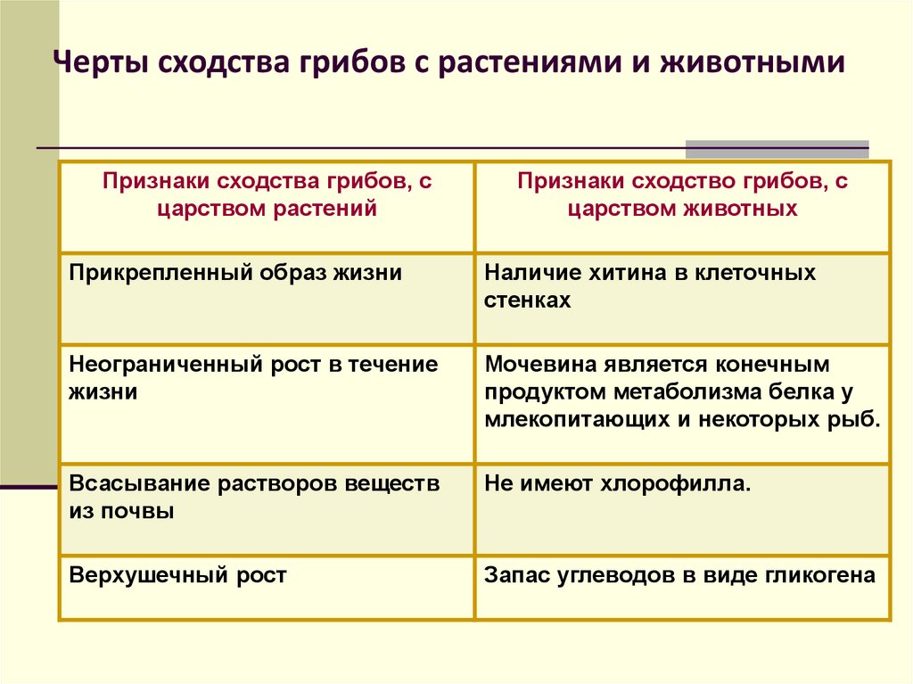 Черты сходства грибов с растениями и животнымиПризнаки сходства грибов, с