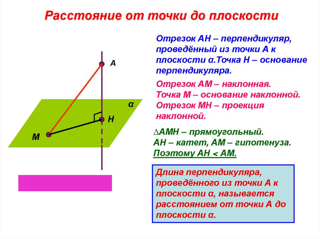 Расстояние от точки до плоскостиОтрезок АН – перпендикуляр,