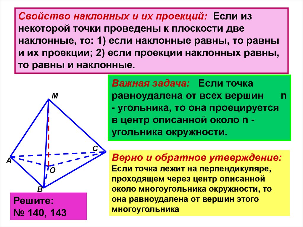 и их проекции; 2) если проекции наклонных равны,