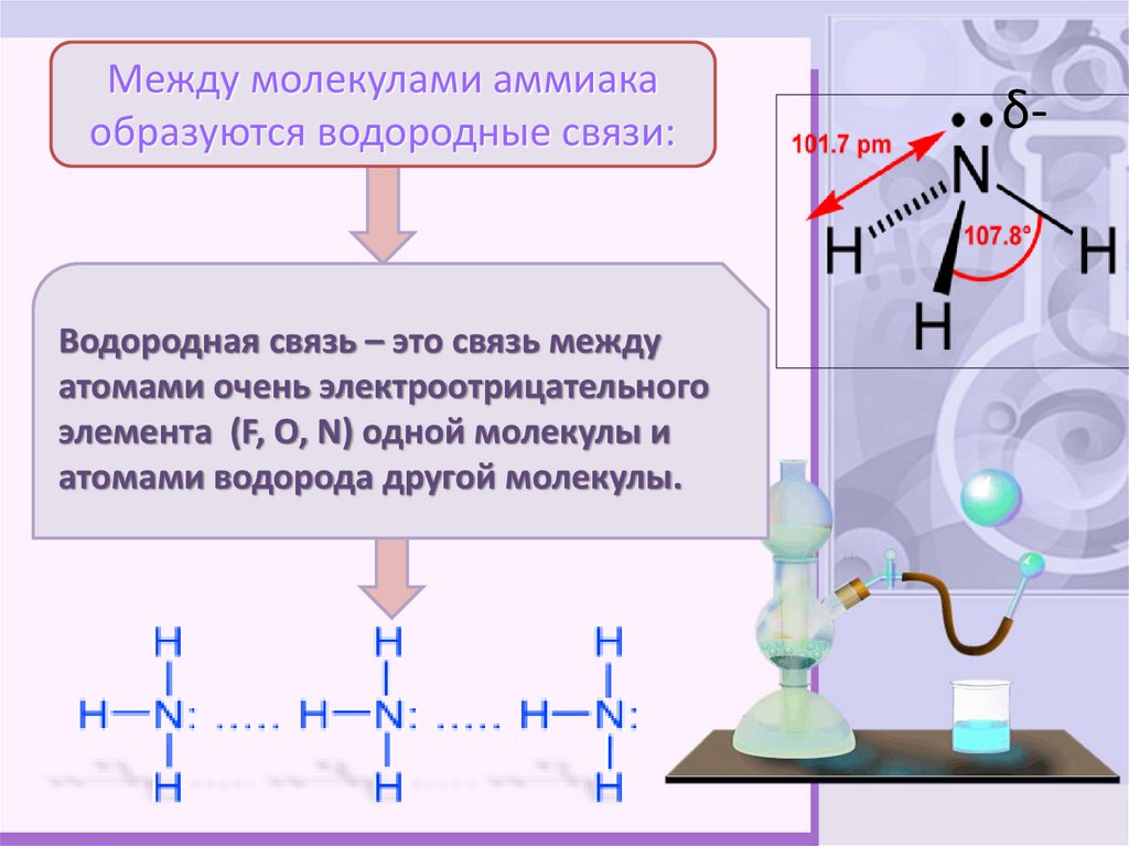 Между молекулами аммиакаобразуются водородные связи: