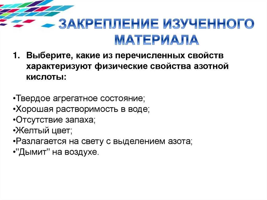 1. Выберите, какие из перечисленных свойствхарактеризуют физические свойства азотной