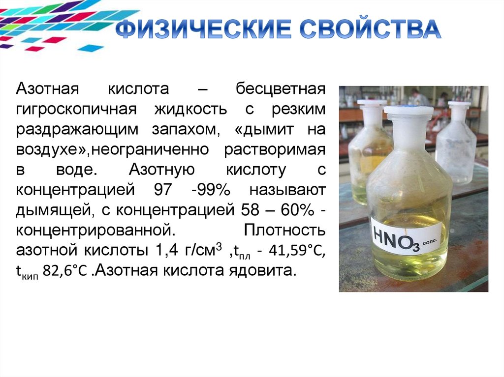 азотной кислоты 1,4 г/см3 ,tпл - 41,59°С,