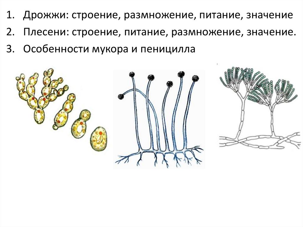 1. Дрожжи: строение, размножение, питание, значение2. Плесени: строение, питание, размножение, значение.
