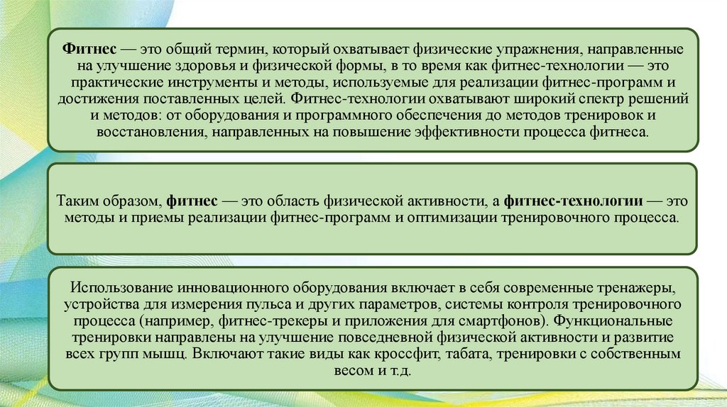 Фитнес — это общий термин, который охватывает физические упражнения, направленныена улучшение здоровья и физической формы, в то время как фитнес-технологии — это