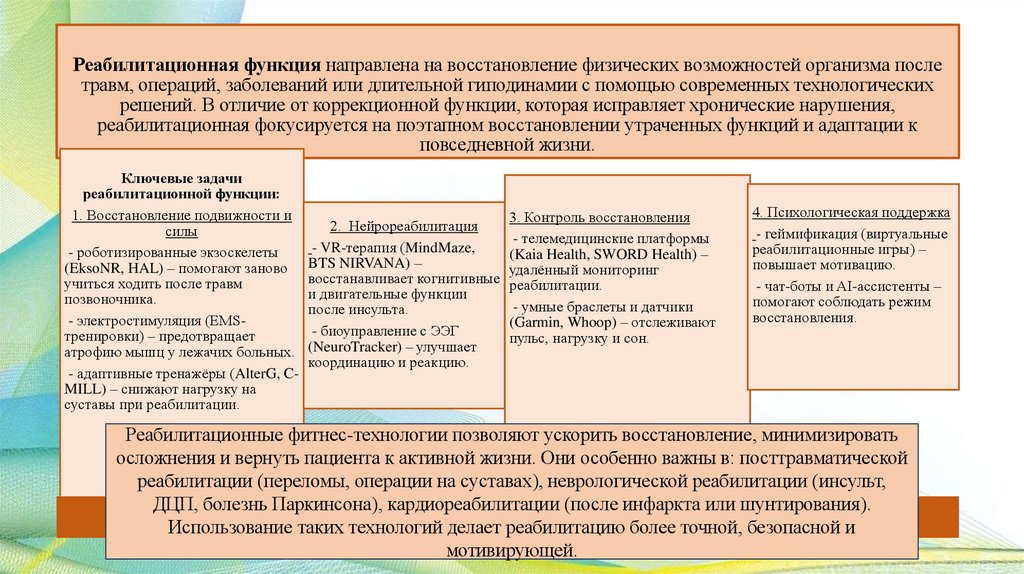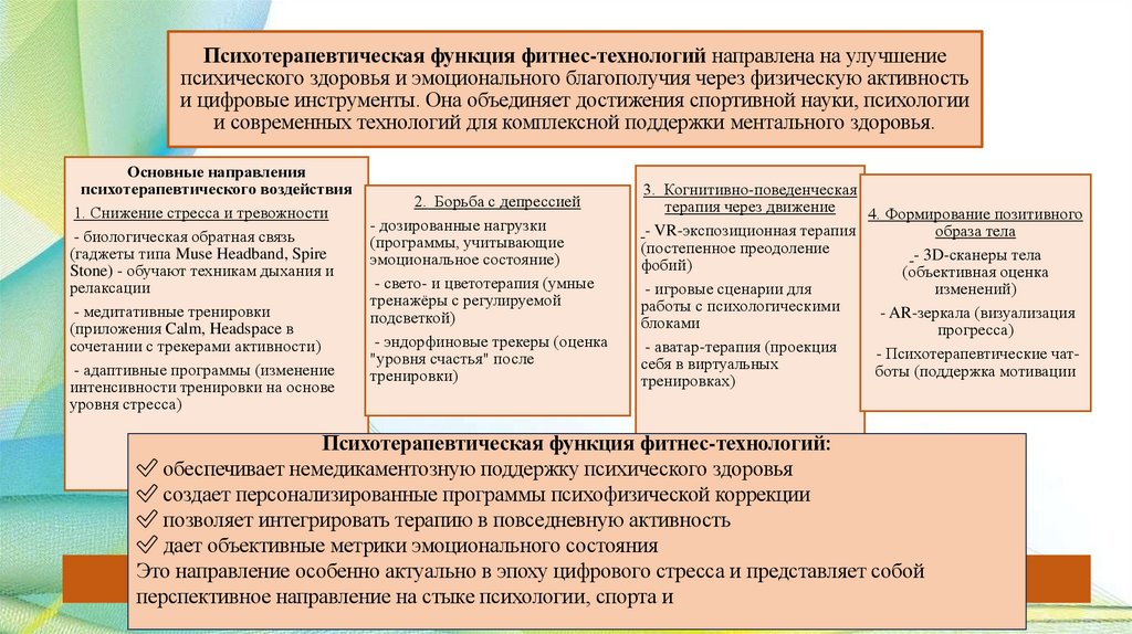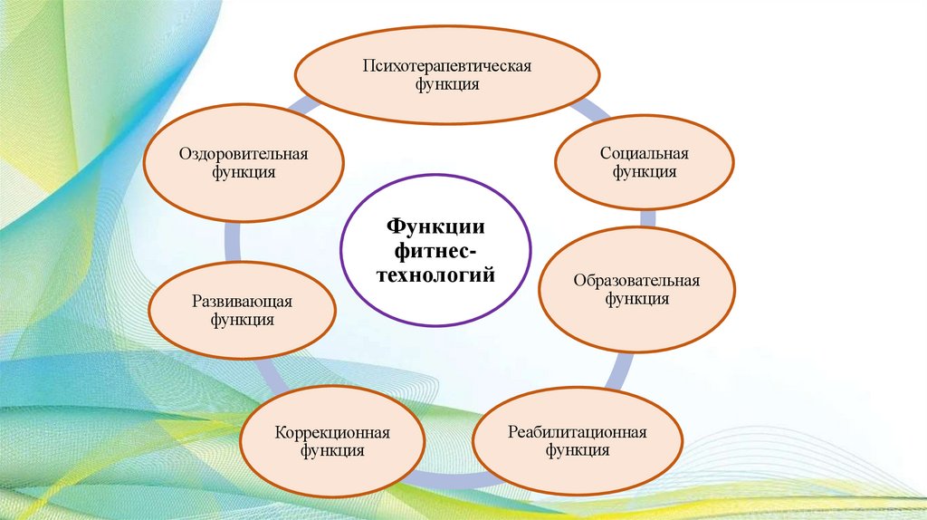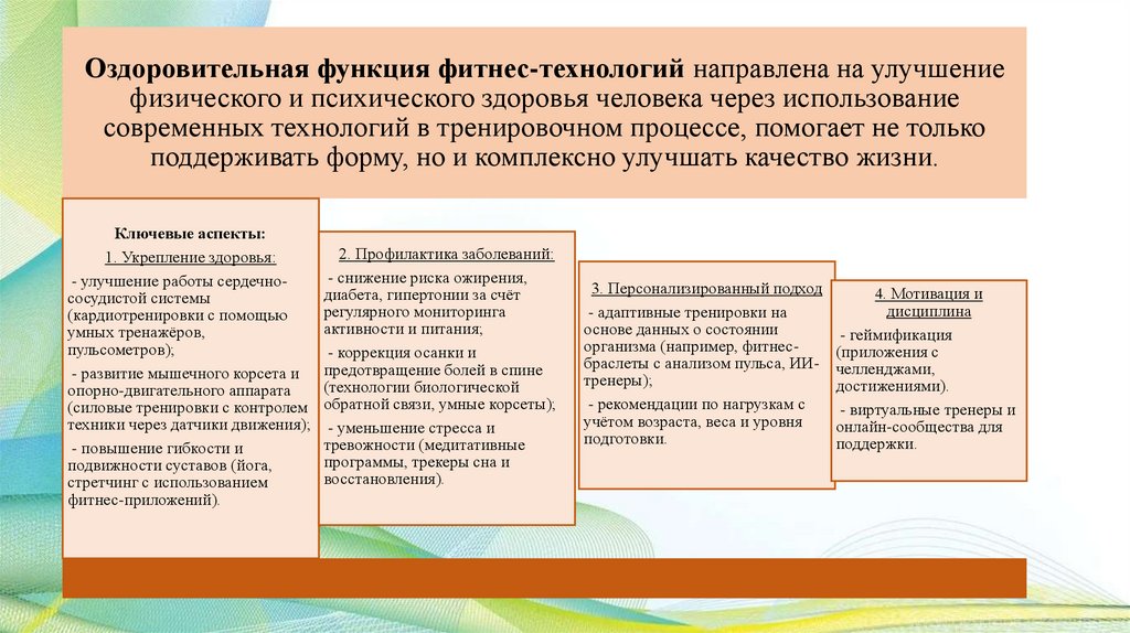 Оздоровительная функция фитнес-технологий направлена на улучшениефизического и психического здоровья человека через использование