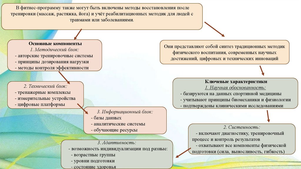 В фитнес-программу также могут быть включены методы восстановления послетренировки (массаж, растяжка, йога) и учёт реабилитационных методик для людей с