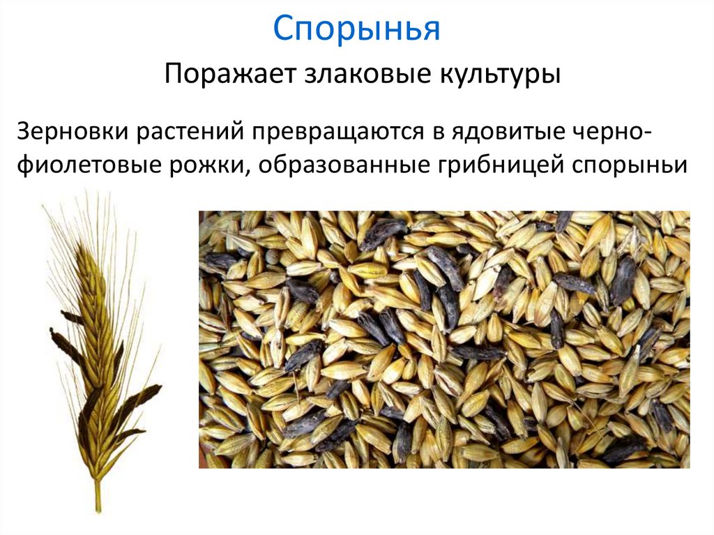 Зерновки растений превращаются в ядовитые чернофиолетовые рожки, образованные грибницей спорыньи