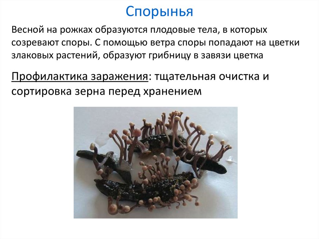 СпорыньяВесной на рожках образуются плодовые тела, в которых