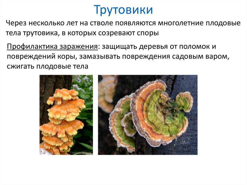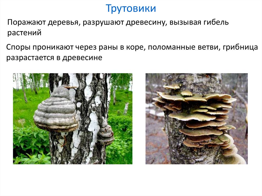 ТрутовикиПоражают деревья, разрушают древесину, вызывая гибель