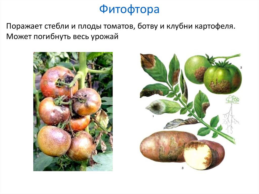 ФитофтораПоражает стебли и плоды томатов, ботву и клубни картофеля.