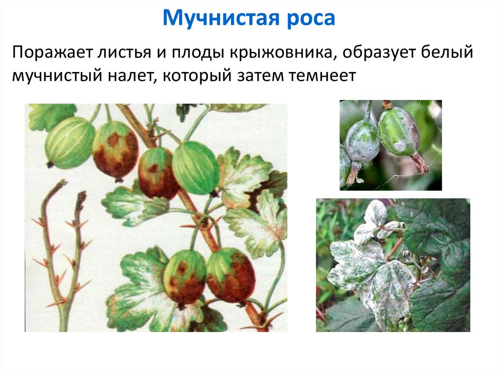 Мучнистая росаПоражает листья и плоды крыжовника, образует белый