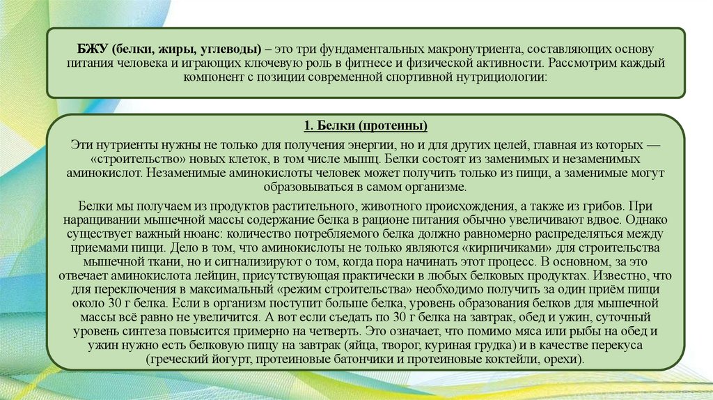 БЖУ (белки, жиры, углеводы) – это три фундаментальных макронутриента, составляющих основупитания человека и играющих ключевую роль в фитнесе и физической активности. Рассмотрим каждый