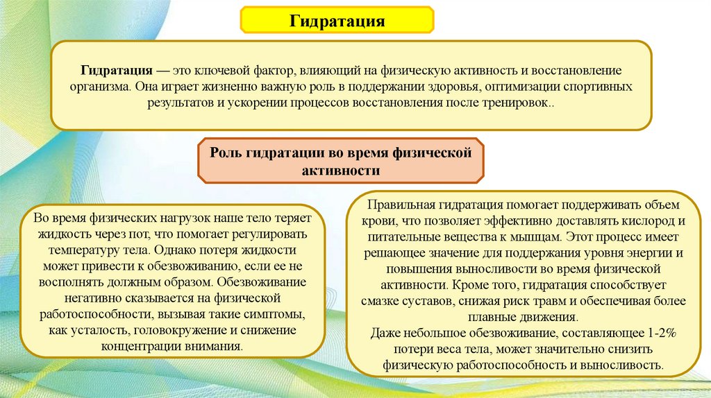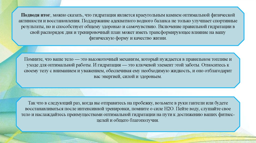 Подводя итог, можно сказать, что гидратация является краеугольным камнем оптимальной физическойактивности и восстановления. Поддержание адекватного водного баланса не только улучшает спортивные