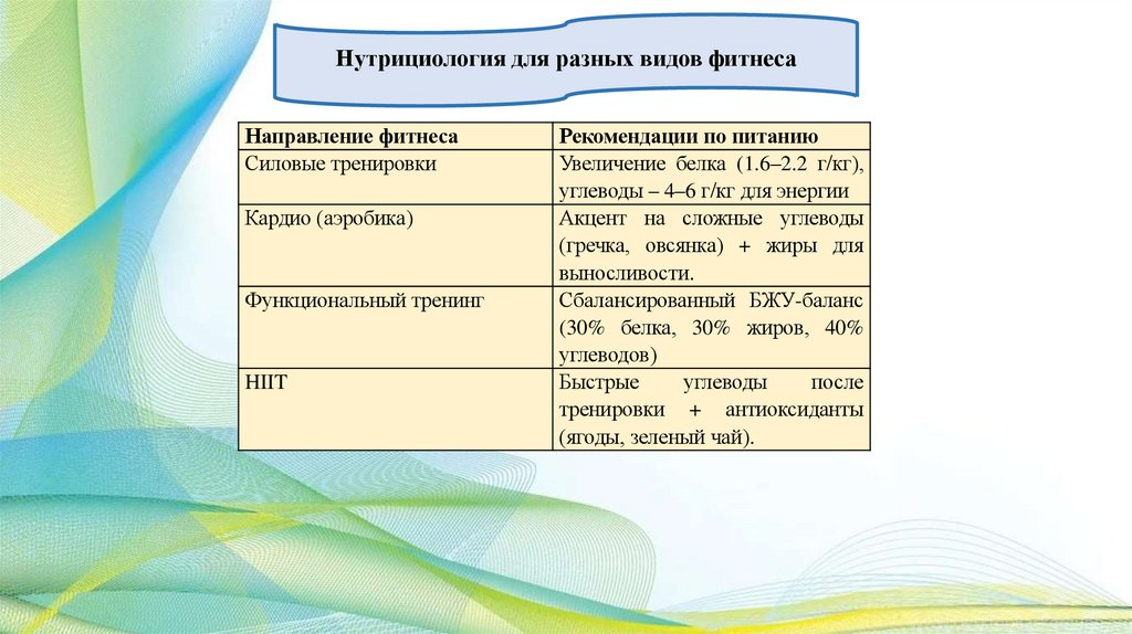 Нутрициология для разных видов фитнесаНаправление фитнеса