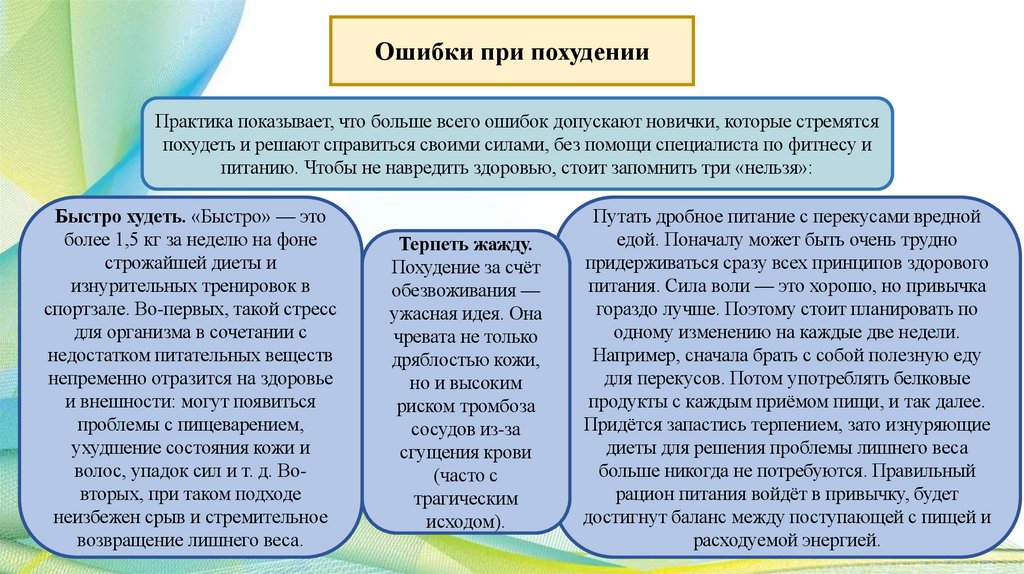 Ошибки при похуденииПрактика показывает, что больше всего ошибок допускают новички, которые стремятся