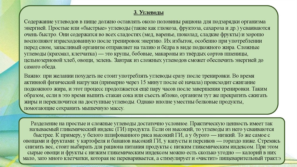 3. УглеводыСодержание углеводов в пище должно оставлять около половины рациона для подзарядки организма