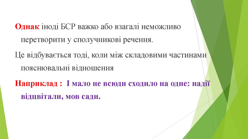 Однак іноді БСР важко або взагалі неможливоперетворити у сполучникові речення.