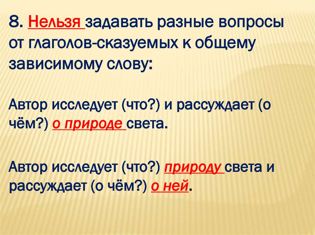 8. Нельзя задавать разные вопросыот глаголов-сказуемых к общему