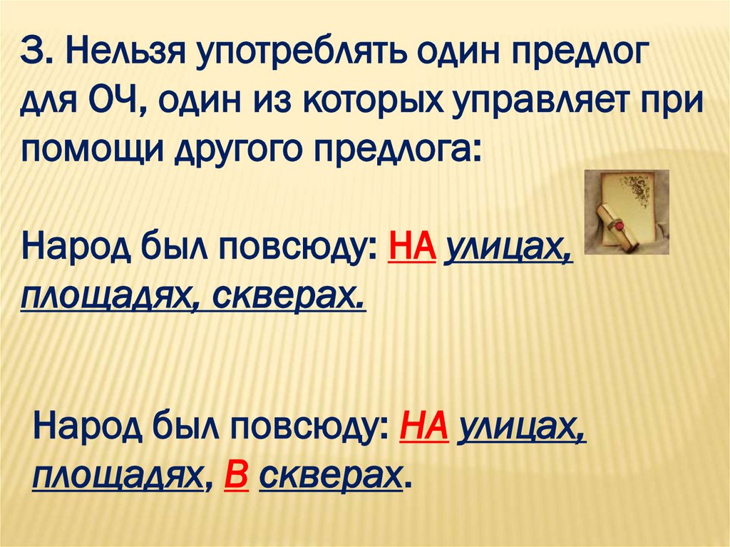 3. Нельзя употреблять один предлогдля ОЧ, один из которых управляет при