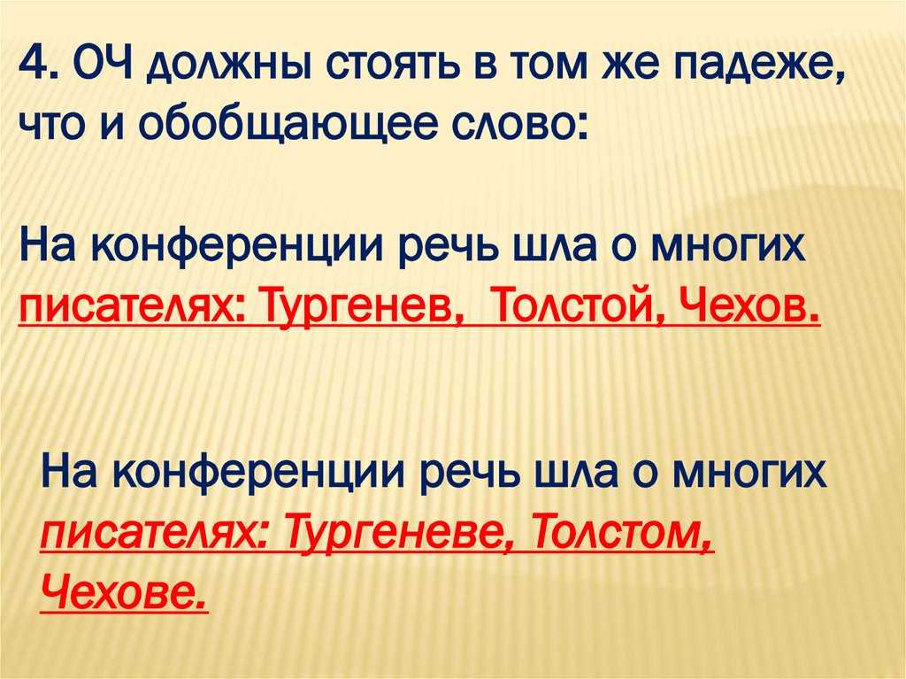 4. ОЧ должны стоять в том же падеже,что и обобщающее слово: