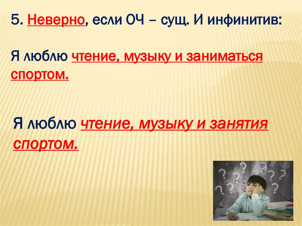 5. Неверно, если ОЧ – сущ. И инфинитив:Я люблю чтение, музыку и заниматься