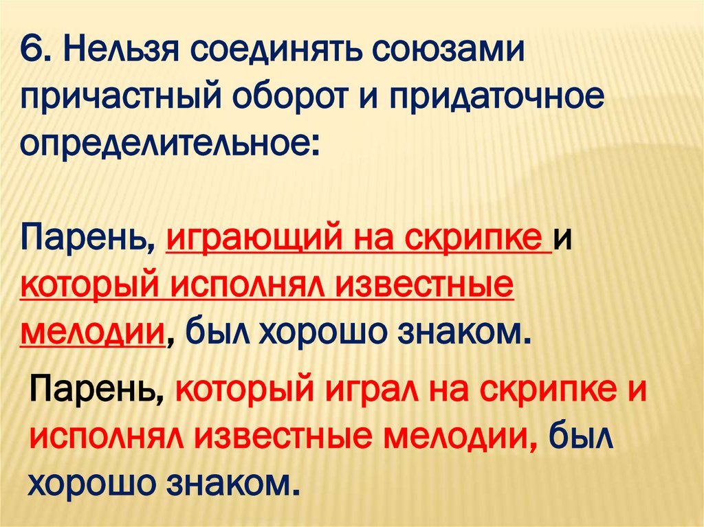 6. Нельзя соединять союзамипричастный оборот и придаточное