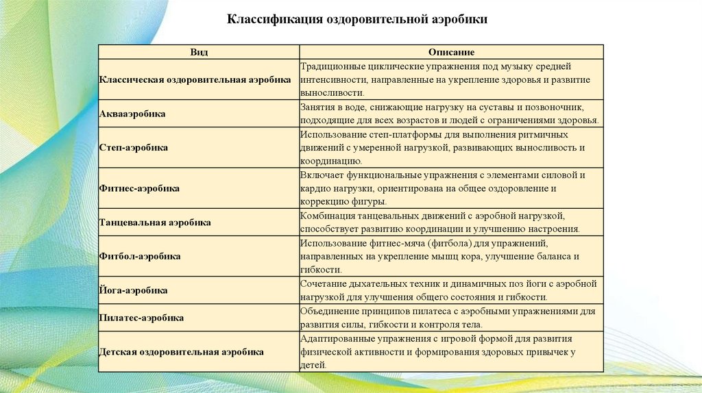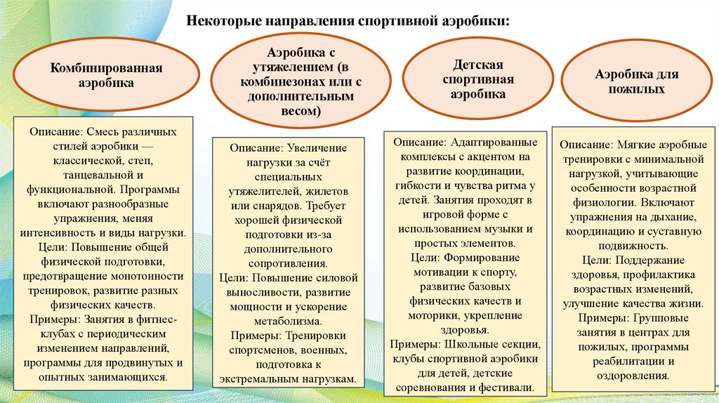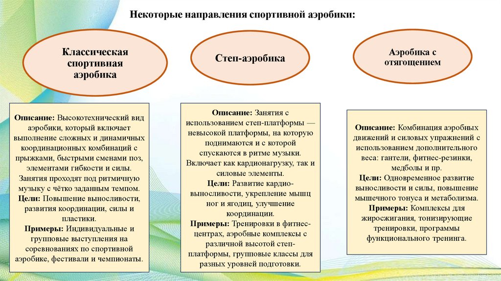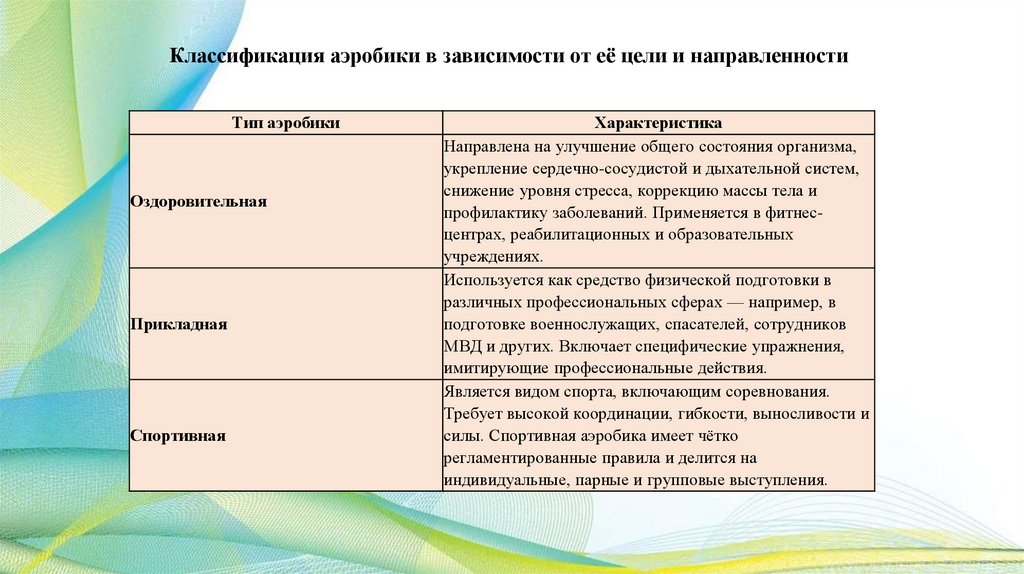 Классификация аэробики в зависимости от её цели и направленностиТип аэробики