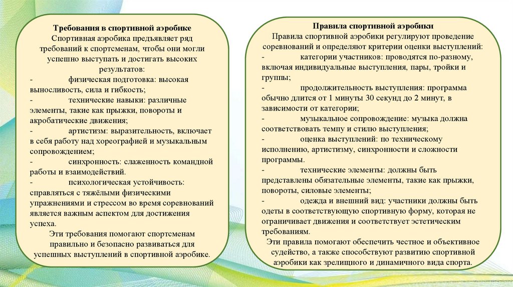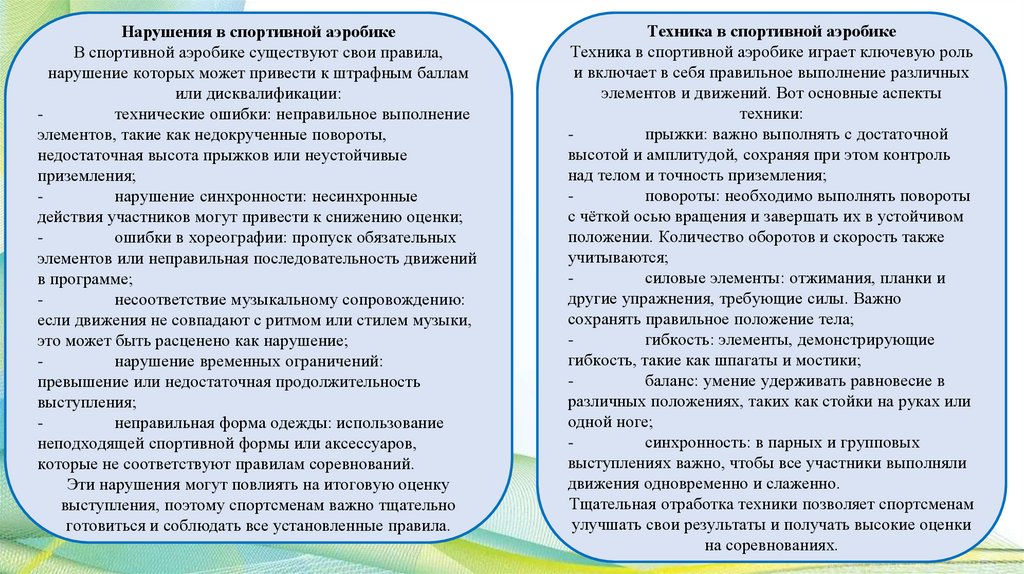 Вот таблица с подробным описанием номинаций соревнований по спортивной аэробике:Номинация