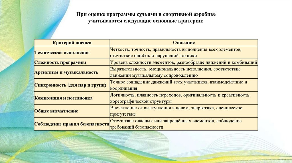 При оценке программы судьями в спортивной аэробикеучитываются следующие основные критерии: