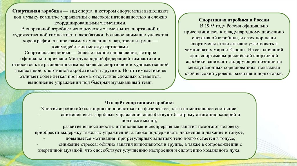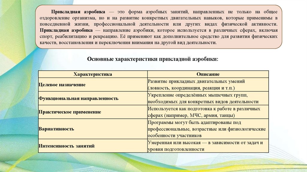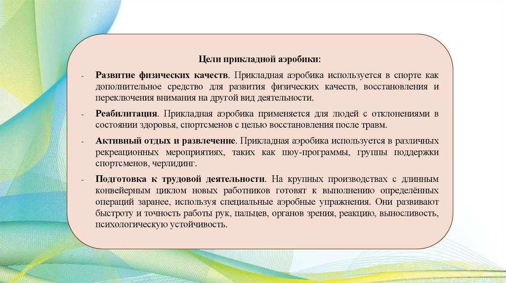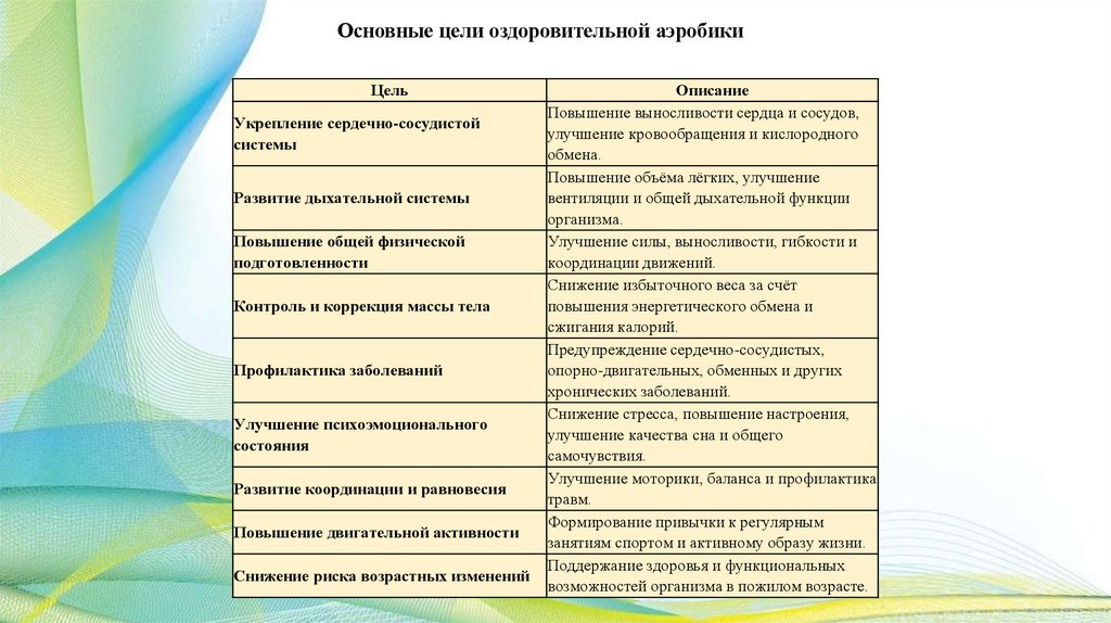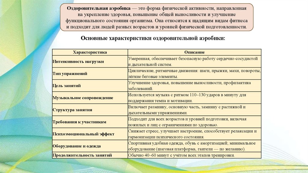 Оздоровительная аэробика — это форма физической активности, направленнаяна укрепление здоровья, повышение общей выносливости и улучшение