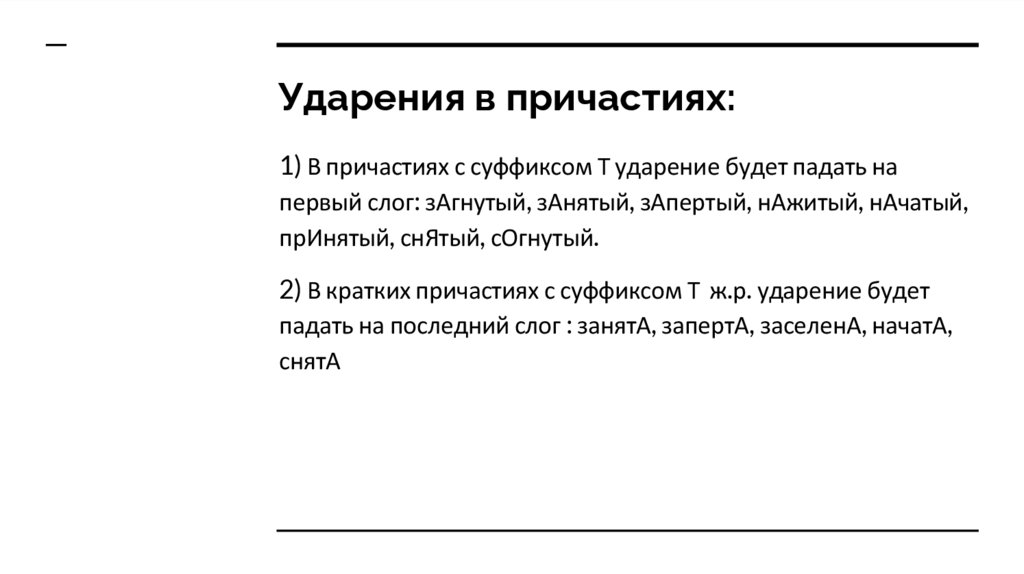 Ударения в причастиях:1) В причастиях с суффиксом Т ударение будет падать на
