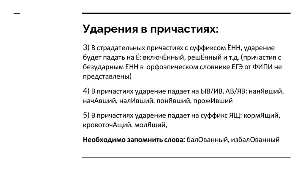 Ударения в причастиях:3) В страдательных причастиях с суффиксом ЁНН, ударение