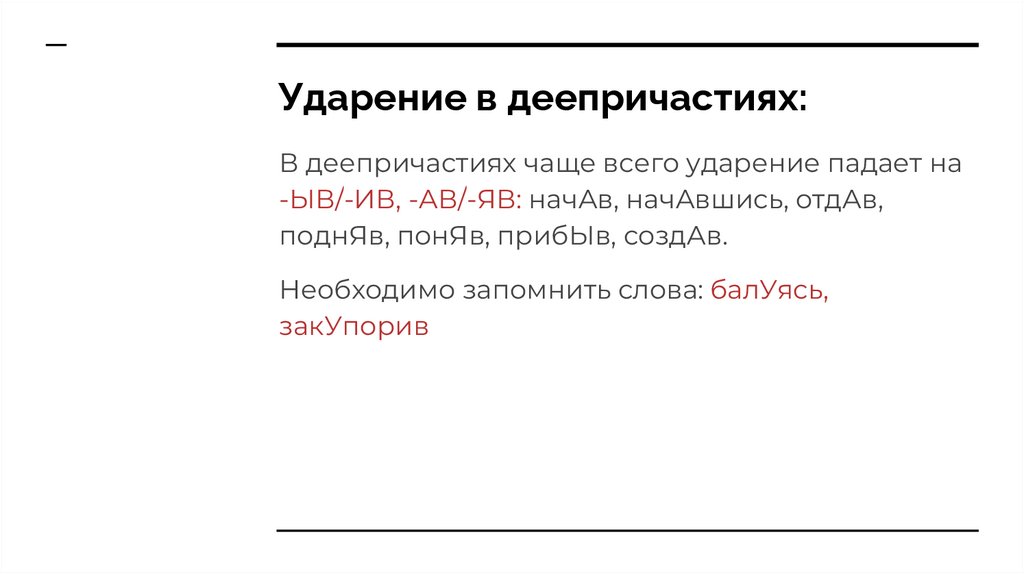 Ударение в деепричастиях:В деепричастиях чаще всего ударение падает на