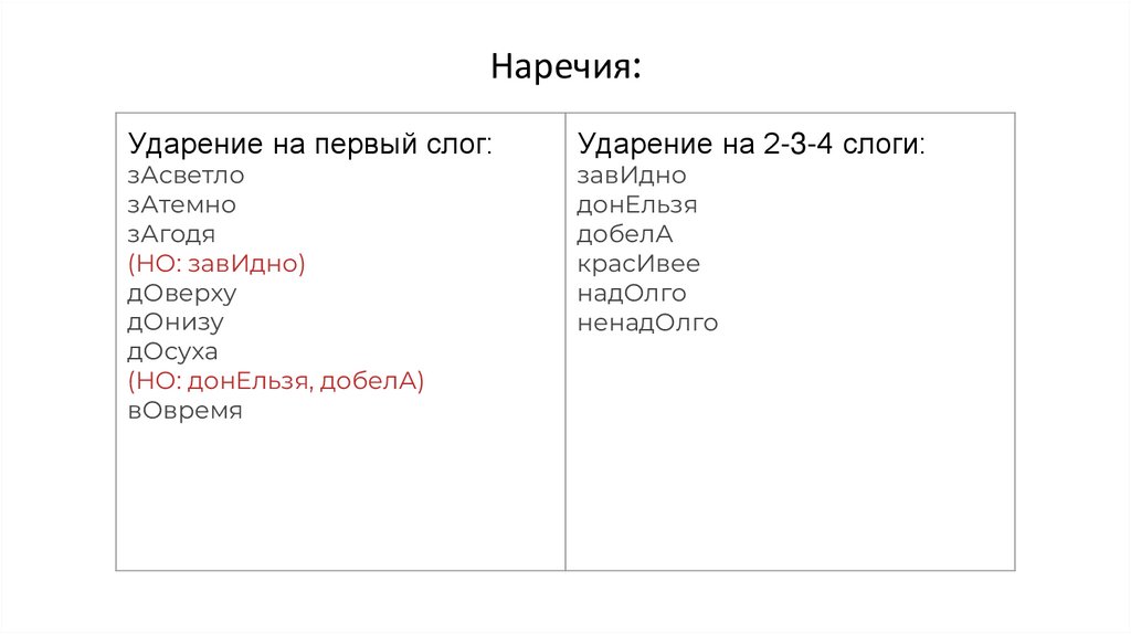 Наречия:Ударение на первый слог: