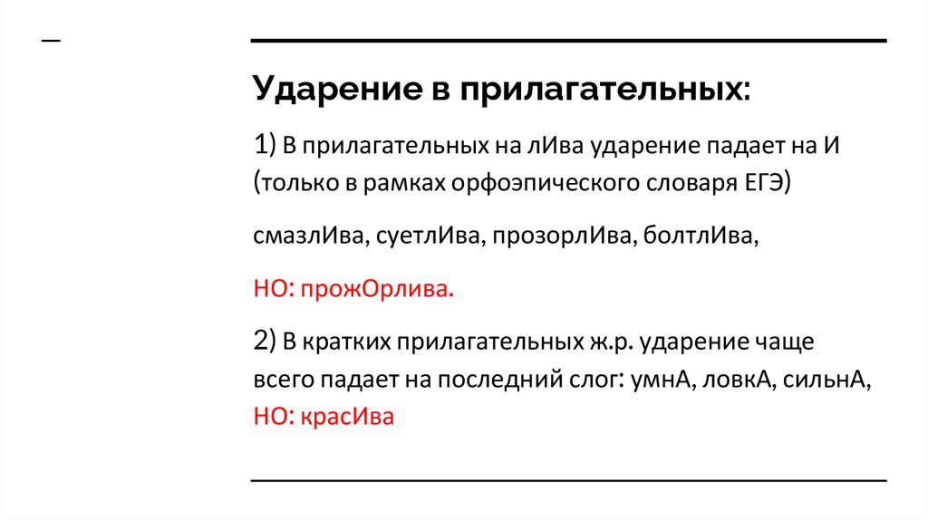 Ударение в прилагательных:1) В прилагательных на лИва ударение падает на И