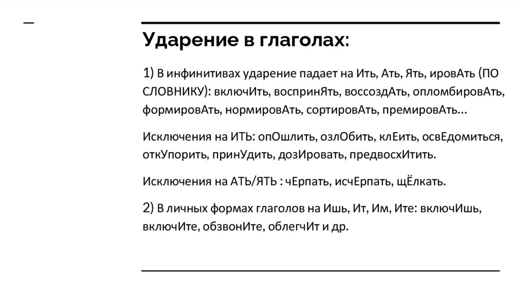 Ударение в глаголах:1) В инфинитивах ударение падает на Ить, Ать, Ять, ировАть (ПО