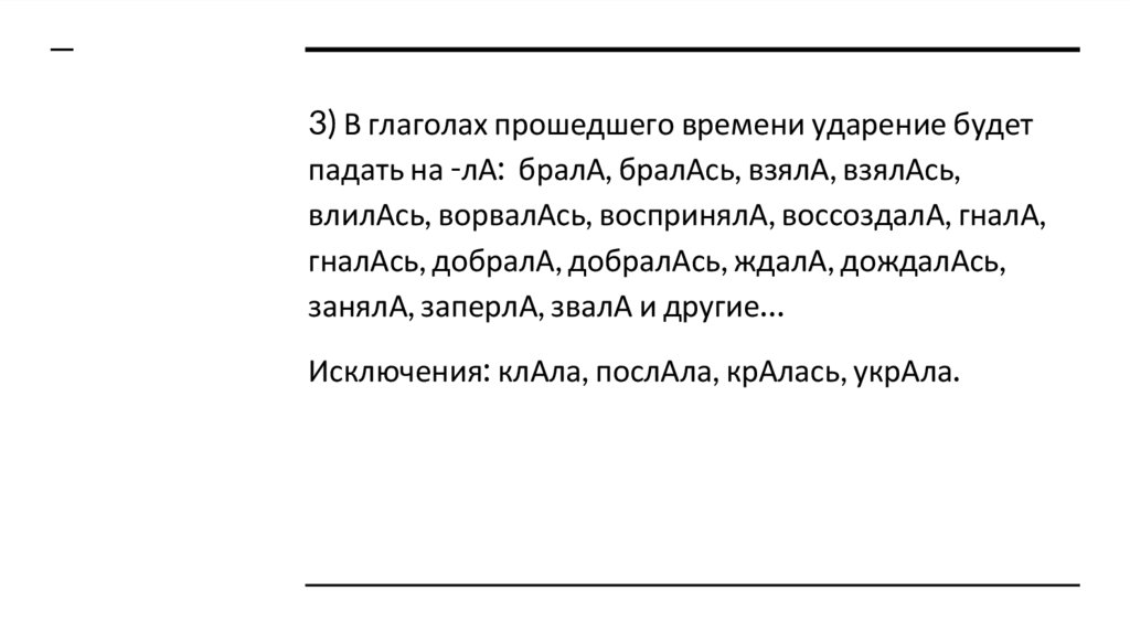 3) В глаголах прошедшего времени ударение будетпадать на -лА: бралА, бралАсь, взялА, взялАсь,