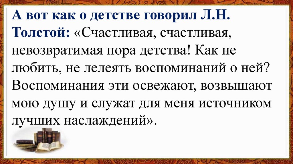 А вот как о детстве говорил Л.Н.Толстой: «Счастливая, счастливая,