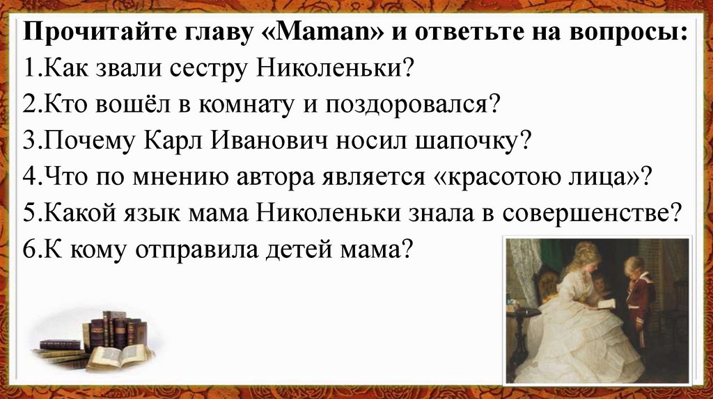 Прочитайте главу «Maman» и ответьте на вопросы:1.Как звали сестру Николеньки?