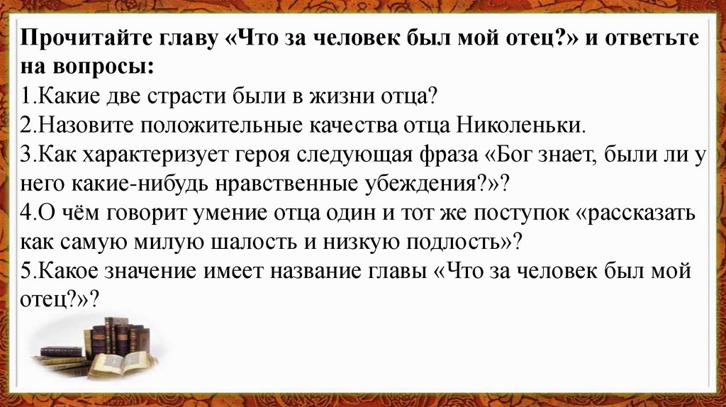 Прочитайте главу «Что за человек был мой отец?» и ответьтена вопросы: