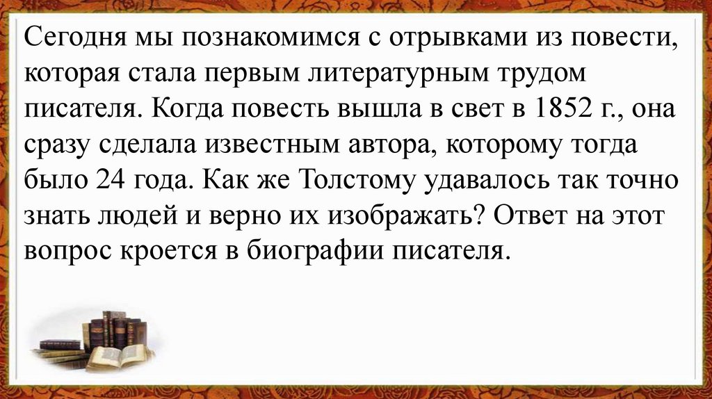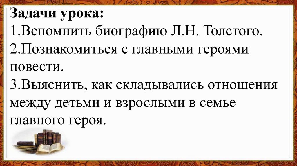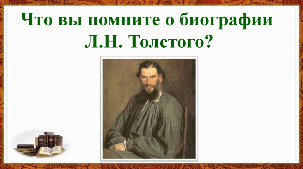 Задачи урока:1.Вспомнить биографию Л.Н. Толстого.