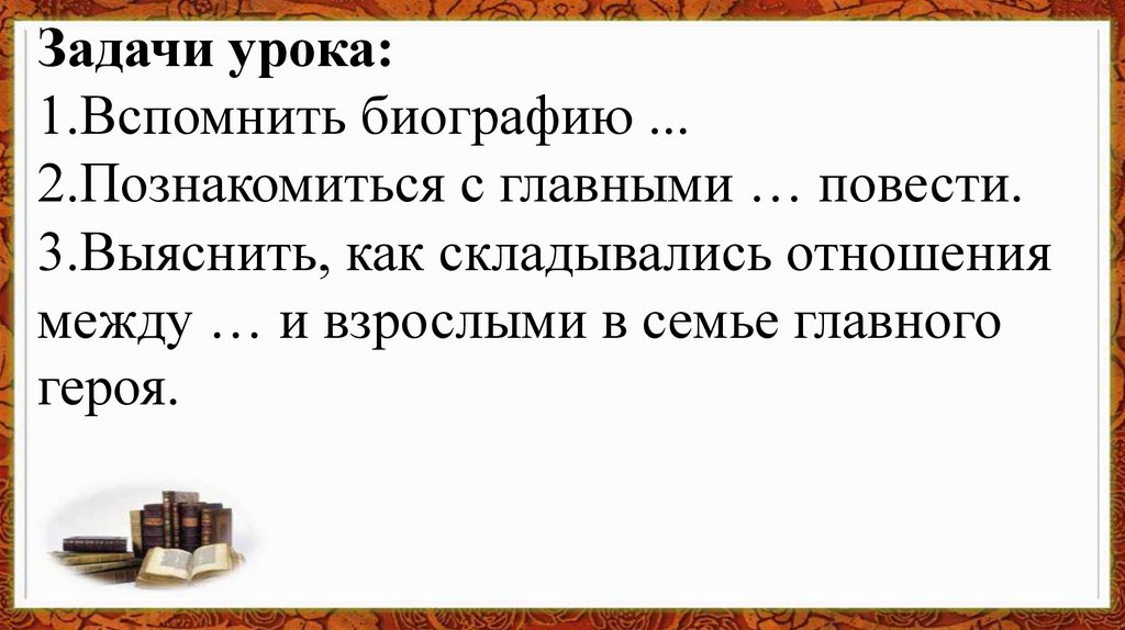 Задачи урока:1.Вспомнить биографию ...